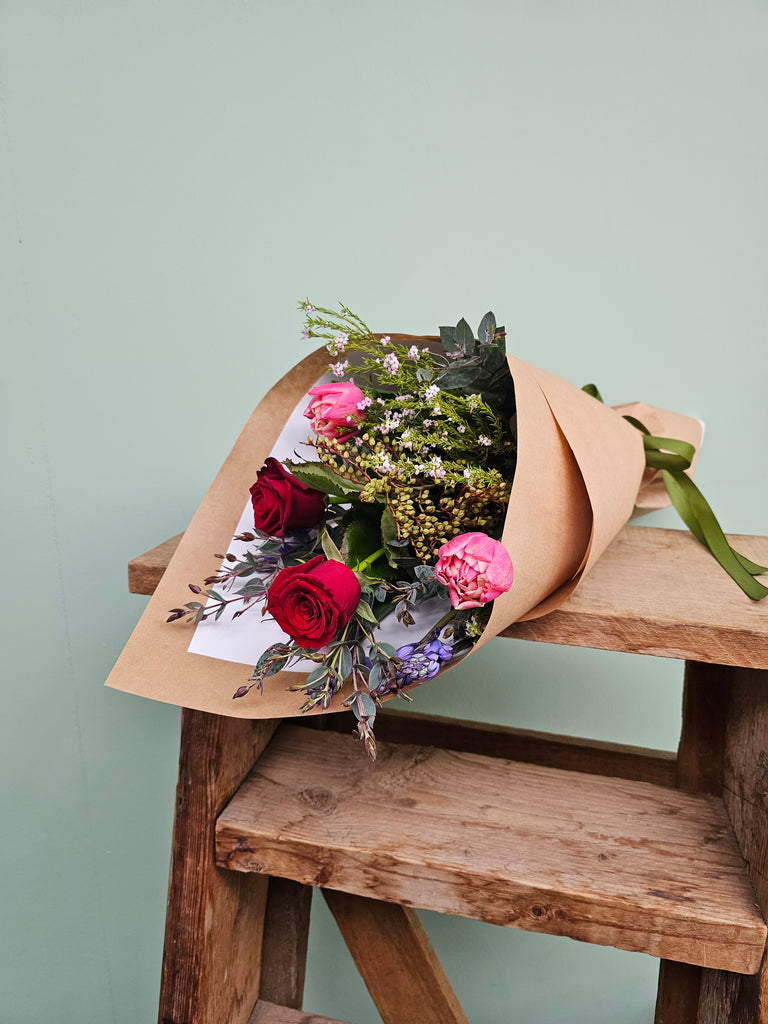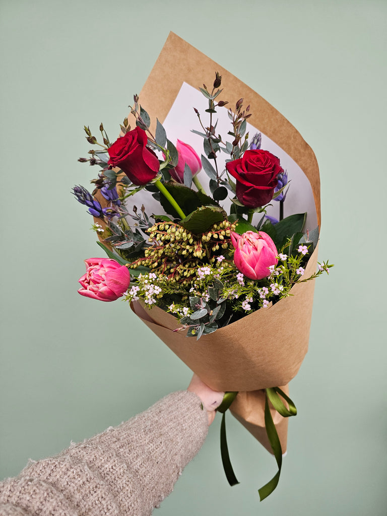 A sweet blend of Tulips, Bluebells, and classic Red Roses, paired with lush greens and wrapped in rustic brown paper. A simple, romantic gesture to brighten your week.